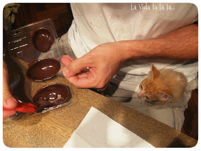 No tenía ni idea de qué hacer hasta el finde pasado que vi unos moldecitos para hacer huevos de Pascua de chocolate en un local de Atlántida. Lamentablemente era domingo y estaba cerrado, pero el lunes de tarde en una tienda de mi barrio que vende todo tipo de artículos para tortas, los vimos de nuevo… y ahí sí, nos tentamos a probar hacer huevitos de Pascua caseros y nos mandamos…