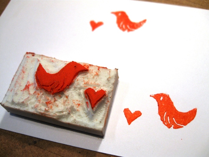 La idea es dibujar en la goma y con una gubia sacar todo el fondo, para que quede en relieve la imagen que querés estampar. Hay que recordar que la imagen queda invertida, sobretodo si pensás escribir letras o algo en donde la dirección realmente afecte al sentido del sellito!