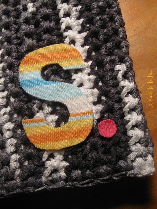 Detalle del resultado final, con apliques en tela y un cordón elastizado a modo de cierre.